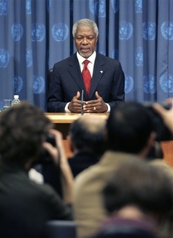 He addressed concerns about a possible military operation in Iran at a farewell news conference in response to a question about how the Security Council should deal with crises after the Iraq war. The council refused to authorize a war against Saddam Hussein in 2003 and Annan called the UN's failure to stop the conflict "the worst moment" of his 10 years as secretary-general. "You mentioned Iran, which implies that there is concern that there may be another military operation there," Annan told a reporter. "First of all, I don't think we are there yet, or we should go in that direction." "I think it would be rather unwise and disastrous," he said. "I believe that the council, which is discussing the issue, will proceed cautiously and try and do whatever it can to get a negotiated settlement for the sake of the region and for the sake of the world," he said. The Bush administration has repeatedly declined to rule out the use of force in Iran, although senior officials have also said their first choice is to rely on diplomacy. A senior US defense official said the idea of building up US Navy forces has been discussed for some time and one proposal is to send a second aircraft carrier to the region. The official, speaking on condition of anonymity because the idea has not been approved, said it's unclear when a decision will be made. Iran insists its nuclear program is aimed solely at the peaceful production of nuclear energy, but the Americans and Europeans suspect Tehran's ultimate goal is the production of nuclear weapons Iranian President Mahmoud Ahmadinejad reiterated Tuesday that possible Security Council sanctions would not stop Iran from pursuing uranium enrichment, a technology that can be used to produce nuclear fuel for civilian purposes or fuel for a nuclear bomb. Annan expressed concern that because of Iran's nuclear program and the