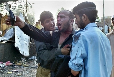 by his colleagues at the site of a bomb explosion in Islamabad, Pakistan