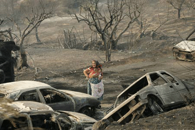With swathes of the Peloponnese peninsula, the island of Evia and parts of eastern suburbs of Athens burning, thousands fled and hundreds of homes and businesses went up in flames, along with tens of thousands of acres (hectares) of forest. Prime Minister Costas Karamanlis said on Saturday the rash of forest fires "can't be a coincidence". He vowed the culprits would be found and punished, implying arsonists were responsible for the deadly blazes since Friday. "All regions of the country are declared in a state of emergency in order to mobilise all means and forces to face this disaster," he said in a televised address to the nation. Politicians interrupted campaigning for a September election, flags were ordered to fly at half mast for a three-day mourning period and Karamanlis said Greece was suffering an "indescribable national tragedy". Church bells tolled as hundreds of villages were evacuated and residents used garden hoses and buckets in a futile effort to save their homes from the raging fires. "The fire is racing towards the town," a resident of the southern town of Aliveri on Evia told Greek television. "We are leaving or else we will burn to death. There is no one to help us," the man said. People fled in cars, trucks and boats, while ferries from Evia were taking people to the mainland near Athens. Ash blanketed the centre of Athens, making breathing difficult, and fires fanned by strong winds raced through dozens of houses in the suburbs of Keratea and Kalyvia. Factories were also set ablaze. "This is complete hell," Kalyvia mayor Petros Filippou told reporters. "The front is 30 km long and has now reached the first houses. That's it." Police evacuated a monastery and closed the motorway from the capital to the main airport for several hours. The fire department said the official death toll had risen to 47, including several children. More were feared dead as many villages remained cut off by walls of flame. Rescuers said they had found bodies by the side of roads, in burned-out homes and in cars, including a mother still clutching her children.  |