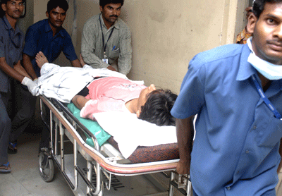Medics move a person injured in a bomb blast on a stretcher, at a hospital in Lumbini Park in the southern Indian city of Hyderabad August 25, 2007. [Reuters]