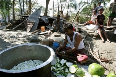 Volunteers prepare to cook food for Bangladeshi cyclone affected people in Chailtatoli village on the southern coastal area of Bangladesh. Urgently-needed supplies of food, water and medicine were nearing people in remote areas of Bangladesh where a devastating cyclone has left millions homeless and thousands dead. [Agencies]