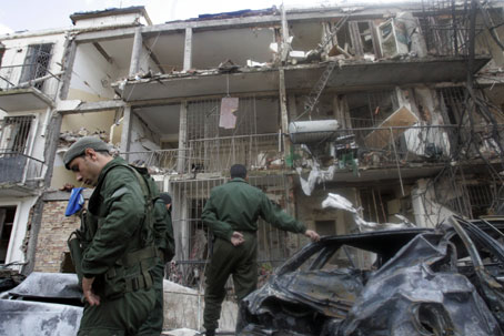 Updated: 2007-12-11 23:38 ![]() Algerian gendarmes stand at the site of a blast at UN offices in the Hydra district of Algiers December 11, 2007. Two car bomb attacks, one of which targeted offices of the UN refugee agency, killed 67 people in the Algerian capital Tuesday, authorities said. [Agencies]