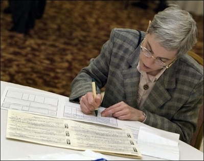 A job-seeker fills out an application at a senior job fair in Palatine, Illinois. The first of the vast US baby boom generation goes into retirement in January, setting off a demographic tidal wave with wide-ranging economic, political and social implications.[Agencies]
