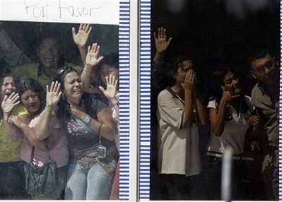 Hostages held by gunmen inside a bank gesture in Altagracia de Orituco, Venezuela, Tuesday, Jan. 29, 2008. Gunmen held more than 30 people hostage inside a Banco Provincial branch during a standoff with police that began with a botched robbery Monday. [Agencies]