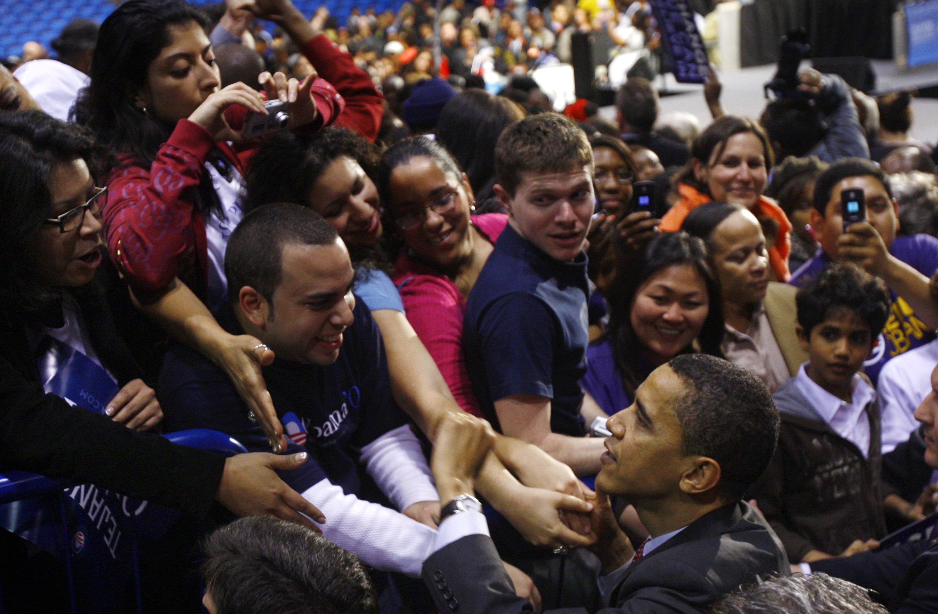 | US Democratic presidential candidate Senator Barack Obama (D-IL) greets supporters after a campaign rally at the George R. Brown Convention Center in Houston, Texas, March 3, 2008. [Agencies] |