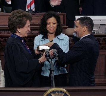 New York Gov. David Paterson, right, is sworn in by Chief Judge Judith Kaye, left, while his wife Michelle Paige looks on, in the Assembly Chamber at the state Capitol in Albany, N.Y., Monday, March 17, 2008. [Agencies]