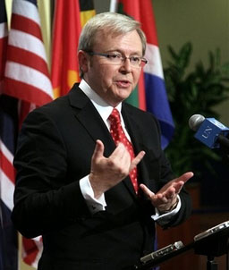Kevin Rudd, Prime Minister of Australia speaks to reporters following his meeting with Secretary General Ban Ki-moon at UN Headquarters, March 29, 2008. [Agencies]