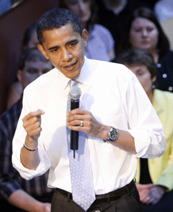 US Democratic presidential candidate Senator Barack Obama (D-IL) leads a discussion on the economy at Vernier Software & Technology in Beaverton, Oregon May 9, 2008. [Agencies]