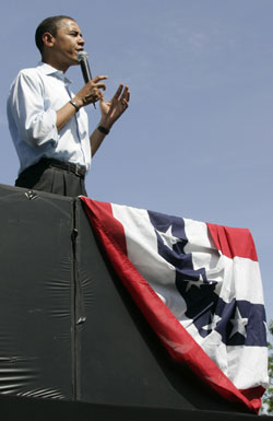 Democratic presidential candidate Sen. Barack Obama (D-IL) addresses supporters at a campaign rally in Tom McCall Waterfront Park in downtown Portland, Oregon May 18, 2008. [Agencies]
