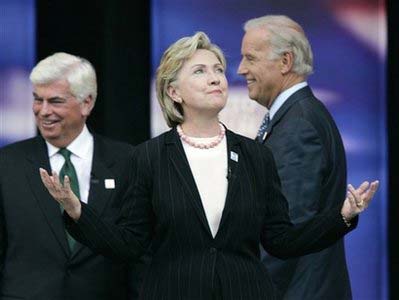 In this Tuesday, Aug. 7, 2007, file photo, Hillary Rodham Clinton comments on the weather as Sen. Chris Dodd (L) and Joseph Biden talk during a break in the presidential forum in Chicago. [Agencies]