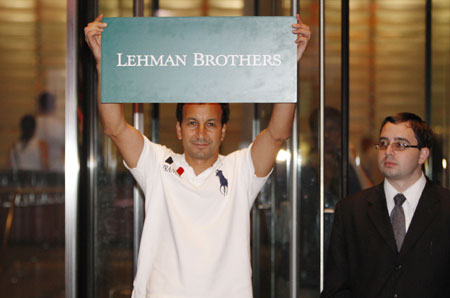 Mo Grimeh (L), a managing director who has worked at Lehman Brothers for ten years, walks out of their building and briefly speaks to journalists as a security guard watches in New York September 14, 2008. Talks faltered when Britain's Barclays Plc, which had appeared to be front-runner to take over Lehman -- excluding its toxic mortgage-related assets -- said it had pulled out of the bidding. [Agencies]