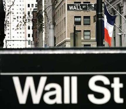 Signs marking the entrance to Wall Street are seen in New York October 6, 2008. US stocks slid more than 6 percent on Monday, with the Dow diving to its lowest level in almost five years, on fears the global economy was hurtling into recession despite government efforts to contain the fast-spreading financial crisis. [Agencies]