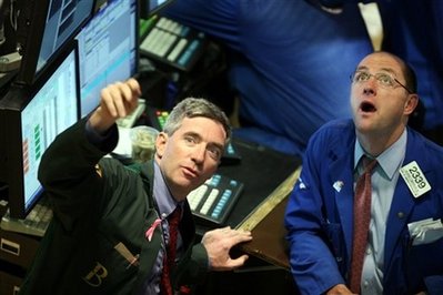 Specialists George F. Moerler, right, accompanied by a Broker, left, watch the monitor as they work on the trading floor at the New York Stock Exchange Friday, Oct. 17, 2008. Wall Street turned sharply higher Friday as strains in the credit markets showed signs of easing and investors snapped up bargains in among stocks that were pounded lower in selloffs earlier in the week. [Agencies]