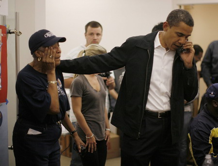 US Democratic presidential nominee Senator Barack Obama (D-IL) comforts Alverna Gracy, 76, as he talks to a potential voter on the phone during his visit to a campaign field office in Charlotte, North Carolina, November 3, 2008. The visit came shortly after the Obama campaign released a statement saying that Obama's grandmother, Madelyn Dunham, had died after a battle with cancer. [Agencies]