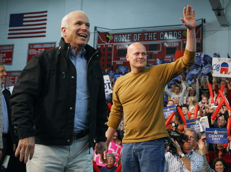 US Republican presidential nominee Senator John McCain (R-AZ) is joined by Joe Wurzelbacher, also known as "Joe the Plumber," at a campaign stop in Mentor, Ohio October 30, 2008. [Agencies]
