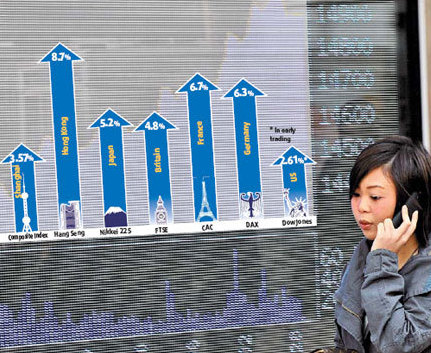 Updated: 2008-12-09 07:09 Progress toward an auto bailout and hopes for massive public works injected life into US equity markets on Monday despite distress signals including new corporate job cuts and a pillar of American media filing for bankruptcy. Chinese and European leaders plotted their next steps as investors looked to governments to lead major economies out of recession because central banks could start running out of room to cut interest rates further.