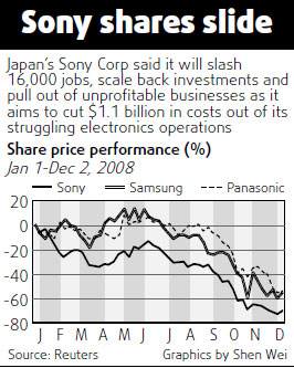 Updated: 2008-12-10 09:12 TOKYO -- Japan's Sony Corp said it will cut 16,000 jobs, curb investment and pull out of businesses to save $1.1 billion a year as the financial crisis ravages demand for its electronics products. The job cuts are the biggest announced by an Asian company so far in the crisis and underscore the challenges facing Sony, which has fallen behind Apple Inc's iPod in portable music and is losing money on flat TVs. Sony said it would cut 8,000 regular workers, or roughly 4 percent of its workforce of 185,800, and an equal number or more temporary and contract staff.