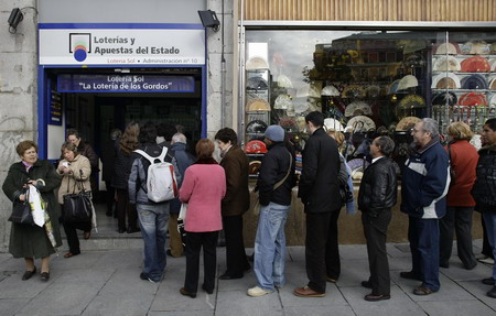 People queue to buy tickets for Spain's state-run lotteries in downtown Madrid December 4, 2008. Besides pawnbrokers, cobblers, betting shops and cheap mobile phone services are doing a good trade as consumers become more thrifty and companies across most of Spain's struggling economy slash jobs and investment. [Agencies]