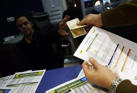 A customer places a bet on a soccer match at the betting shop Victoria in Madrid October 11, 2008. Besides pawnbrokers, cobblers, betting shops and cheap mobile phone services are doing a good trade as consumers become more thrifty and companies across most of Spain's struggling economy slash jobs and investment. [Agencies]