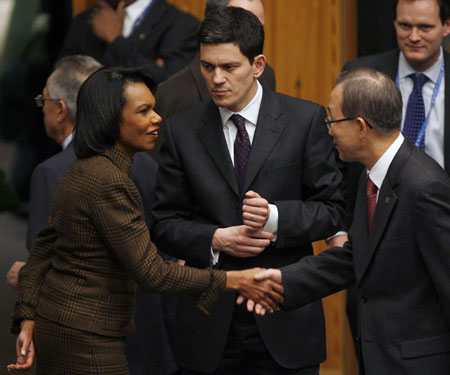 US Secretary of State Condoleezza Rice (L) and Britain's Foreign Secretary David Miliband greet UN Secretary-General Ban Ki-moon before a United Nations Security Council meeting to address piracy off the coast of Somalia at the UN headquarters in New York December 16, 2008. [Agencies]