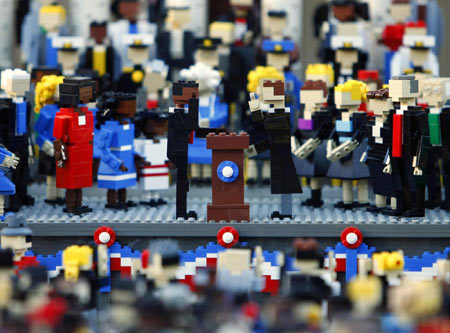More than a thousand 4 inch high mini-figures are shown on display as Legoland unveils a replica of the 56th presidential inauguration in Carlsbad, California January 16, 2009. US President-elect Barack Obama his wife and family are shown at left as Chief Justice John Roberts swears in the new president on the steps of the Capital building all made of lego. [Agencies]