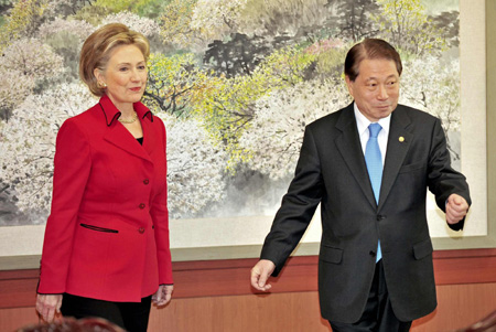 US Secretary of State Hillary Clinton (L) is guided by her South Korean counterpart Yu Myung-Hwan during a meeting in the Foreign Ministry in Seoul February 20, 2009. [Agencies]