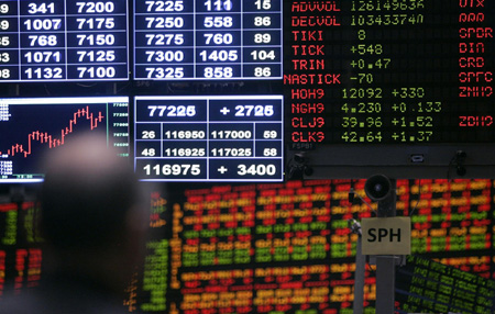 A trader in the S&P 500 pit at the Chicago Board of Trade checks out the trading boards shortly before the closing bell in Chicago, Illinois February 24, 2009. [Agencies]