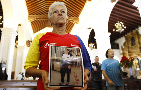 A supporter of Venezuelan President Hugo Chavez holds a picture of him, as she attends a mass to pray for Chavez's health in Caracas Dec 24, 2012. [Photo/Agencies] |