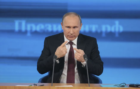 Ukrainian President Viktor Yanukovich (L) gives a wink to his Russian counterpart Vladimir Putin during a signing ceremony after a meeting of the Russian-Ukrainian Interstate Commission at the Kremlin in Moscow in this Dec 17, 2013 file photo. [Photo/Agencies] |