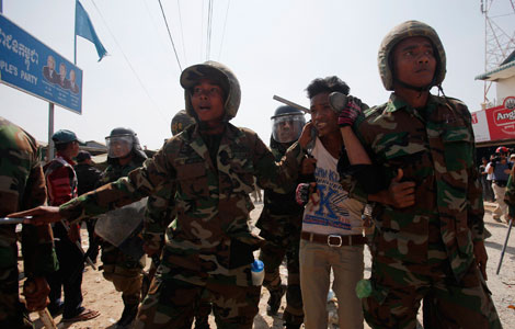 Cambodian soldiers escort a worker who had been taking part in a protest after clashes broke out, on the outskirts of Phnom Penh January 2, 2014. [Photo/Agencies] |