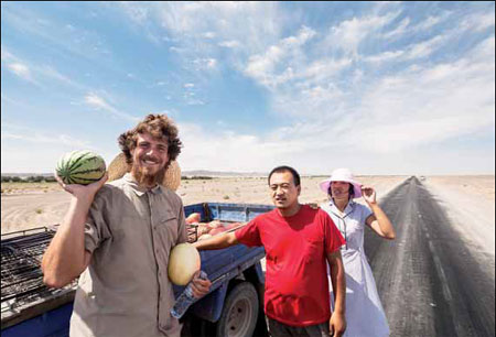 Above: While walking through the Gobi desert, Rehage often received watermelons as gifts. Left: Rehage at a coal mine. |