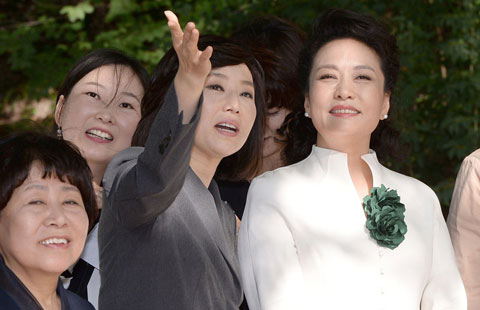 Chinese first lady Peng Liyuan, accompanied by South Korean officials, visited the ancient Changdeokgung Palace in Seoul on July 3.