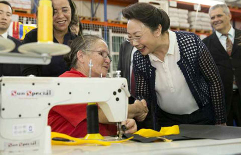Cheng Hong, wife of Chinese Premier Li Keqiang, talks with a worker while visiting a social factory providing vocational training for the poor in Brasilia, capital of Brazil, on May 19, 2015.