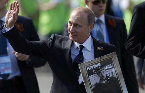 Russian President Vladimir Putin holds the portrait of his father as he takes part in the Immortal Regiment march on the Red Square during the Victory Day celebrations in Moscow, Russia, May 9, 2015.