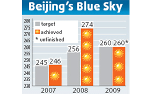 Beijing residents are taking a collective deep breath and enjoying the best air the city has had for 11 years. The Chinese capital hit its 2009 target of 260 blue-sky days a staggering 41 days before the end of the year.