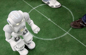 Students' robots move around a specially designed miniature soccer pitch during the European robotic soccer competition at the University of Business and Technology in Kosovo's capital Pristina May 5, 2011.