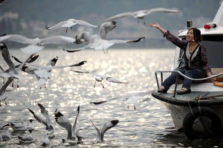 3月18日,一個女孩正在滇池游船上給紅嘴鷗投食。 隨著春天到來,氣候漸暖,前來昆明越冬的西伯利亞紅嘴鷗開始啟程返回。據(jù)了解,紅嘴鷗大部隊已經(jīng)陸續(xù)離開昆明,只剩下少部分在滇池、草海一帶“流連忘返”,全部紅嘴鷗離開昆明要到三月底。 新華社記者秦晴攝
