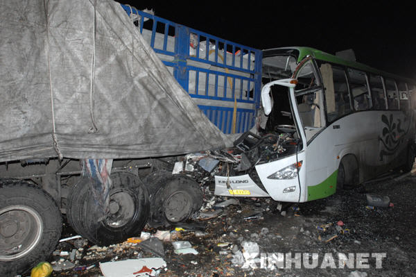 記者19日20時(shí)40分趕到事故現(xiàn)場(chǎng)時(shí),客車內(nèi)被困人員已經(jīng)被救出送往醫(yī)院。記者在現(xiàn)場(chǎng)看到,一輛車號(hào)為黑L49970的客車右前部與一輛車號(hào)為黑D29033的貨車左后部相撞??蛙囀軗p嚴(yán)重,車身已經(jīng)被破拆,車廂右側(cè)基本已大部分敞開,部分座椅已被拆除扔到道路一旁,車內(nèi)物品連同破碎玻璃散落一地。記者還在現(xiàn)場(chǎng)看到了一輛小轎車和另一輛翻在路邊溝中的貨車,均已不同程度受損,公路右側(cè)的護(hù)欄也被撞倒。