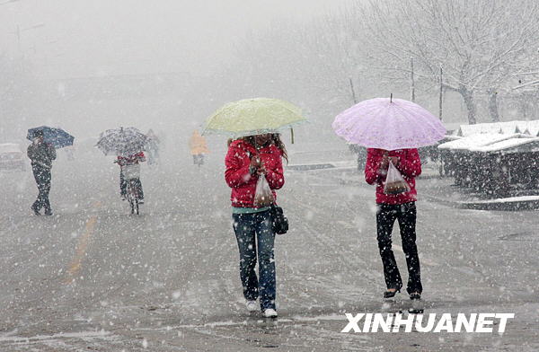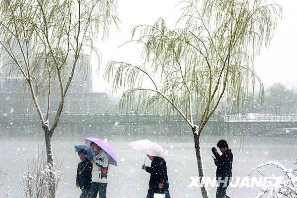 3月24日,山東濱州學(xué)院的幾名學(xué)生冒雪行走在校園里。當(dāng)日,山東部分地區(qū)迎來(lái)雨夾雪,個(gè)別地區(qū)還出現(xiàn)了中到大雪。專家介紹說(shuō),此次降雪有利于改善土壤墑情,但低溫也可能帶來(lái)凍害。新華社發(fā)