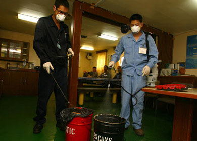 4月28日,浙江寧波檢驗(yàn)檢疫工作人員在一艘船上為海員測(cè)量體溫。目前,浙江省寧波市檢驗(yàn)檢疫、邊防檢查等部門(mén)已啟動(dòng)應(yīng)急機(jī)制和措施,嚴(yán)防豬流感疫情流入。新華社發(fā)(代茂增 攝)