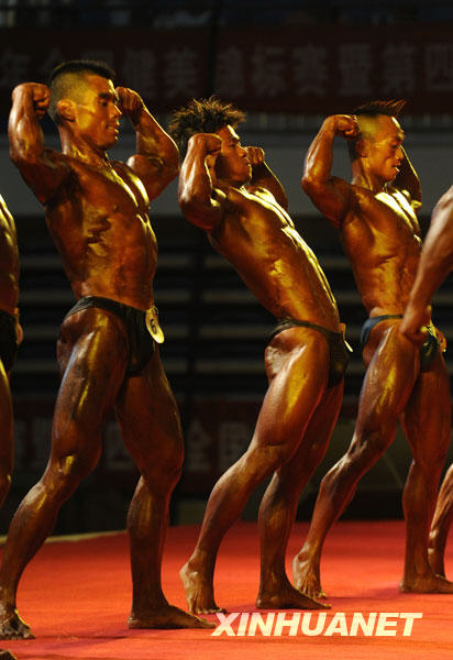 6月27日,男子組選手在安徽合肥體育中心進(jìn)行比賽。當(dāng)天,2009年“舒華杯”全國(guó)健美錦標(biāo)賽暨第四屆全國(guó)體育大會(huì)健美預(yù)選賽在合肥開賽。來自全國(guó)26支代表隊(duì)的近200名運(yùn)動(dòng)員展開激烈角逐。新華社發(fā)(沈鄉(xiāng)攝)